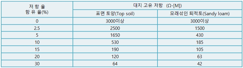 Note : 전해질 농도가 많은 지역으로는 해안매립지 (부산, 경남) 등이 있는데 이런 지역은 저항율의 저감 효과보다는 부식 방지에 적합한 접지 재료의 선택이 무엇보다 중요하며 이런 지역에는 국내 접지 재료중 WELDING 자재가 적합하다고 생각됨