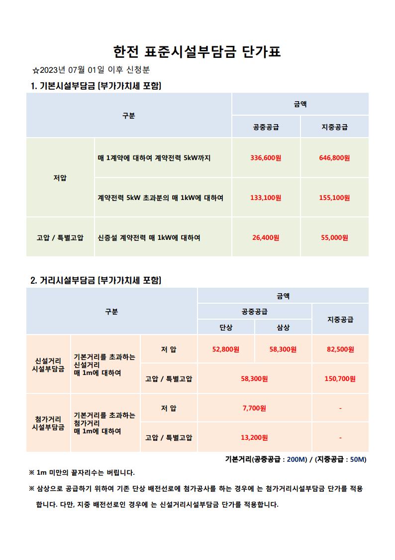 2023년도 한전 표준시설부담금 단가표 입니다. 2023. 07. 01일 부터 적용분 입니다.