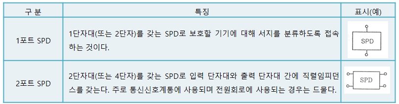 ① SPD는 회로에 접속한 단자형태에 따라 1포트 SPD와 2포트 SPD가 있으며, 각각의 SPD 특징 및 표시 예는 아래 표 6과 같다.