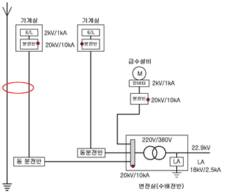 SPD를 선정할 때는 보호레벨, LPZ, SPD의 등급 등을 선정하는 것이 중요하다. 특별고압 수용가의 승강기 분전함, 급수설비 분전함 및 변전설 저압측 모선 등에 그림(Fig02)과 같이 SPD를 적용하며, 그 설치 환경기준은 IEEE C62.41 Category C3의 1.2/50 ㎲ - 8/20 ㎲, 20 ㎸/10 ㎄크기의 서지가 침입하는 것으로 하여 설치한 사례이다.