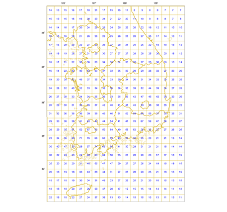 < Fig02. 연간 뇌우일수도(IKL Map : 1996~2004, 한국전력연구원 제공) >