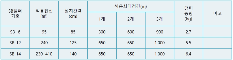 (2) 스톡크 브릿지 댐퍼 설치수량 및 간격은 표와 같으며 다음 개소에 설치한다.