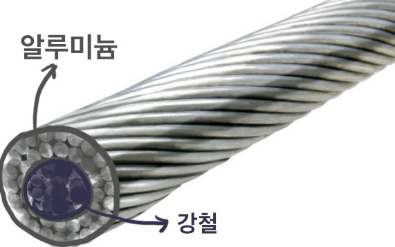 - 도전율은 구리보다 낮지만 기계적강도(철로 보강했으니까)가 커서 긴 거리용(장경간용)에 적합