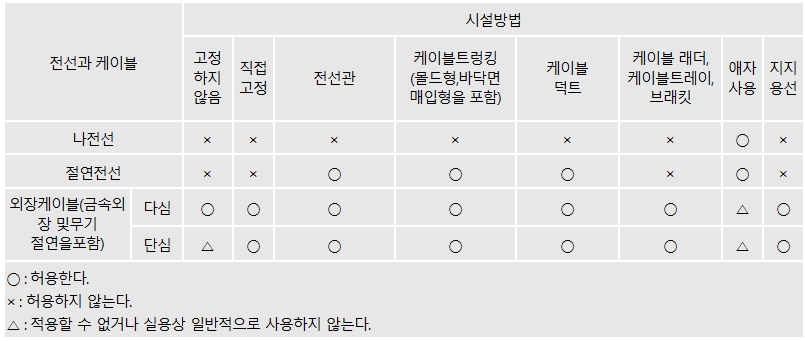 이 표는 전선(나전선, 절연전선) 및 케이블을 사용하는 경우의 시설방법(공사의 종류)의 옳고 그름을 나타내는 것으로 표에 사용된 용어 및 배선방식의 선정에 대하여 해설한다.