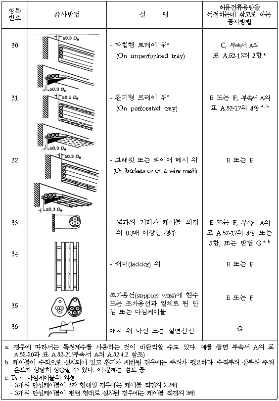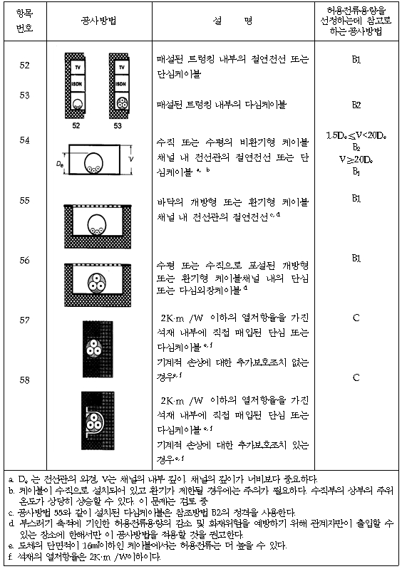 표 2-3 허용전류용량 선정지침을 제시하는 공사방법 표[IEC60364-52의 표52-3(52H)]