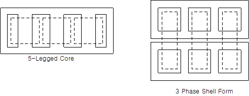 5각(5-legged) core는 yoke의 폭을 줄여서 core전체 높이를 낮출 수 있는 장점이 있다.