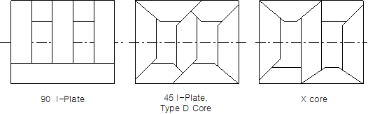 90도 I-plate 코어는 압연 강판(hot rolled steel)에 사용되고, D-core와 X-core는 방향성 강판에 사용된다.