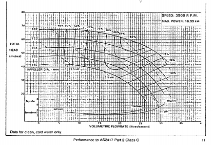 예를들어 170Lpm x 15M인 경우, 65A인 펌프가 선정될 수 있고(그림 Fig01), 80A인 펌프가 선정될 수 있다(그림 Fig02). 이 경우 선정기준은 주위배관이 아니고 효율로써 판단해야 한다. 즉, 65A인 경우 78%를 약간 웃돌고 80A인 경우 63%인 정도이다. 따라서 각각의 동력은 65A인 경우 3HP이나 80A인 경우 4HP이다. 즉, 펌프선정의 첫째 기준은 효율이다.