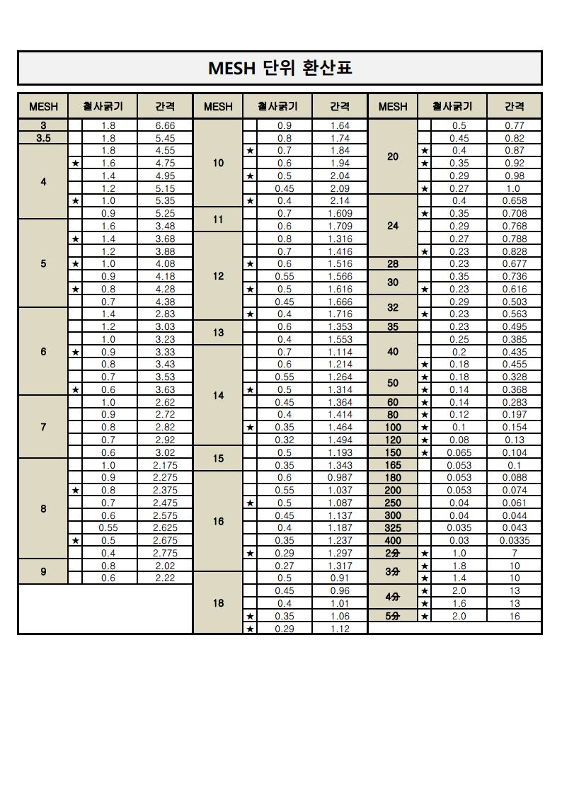 "Mesh"는 영어로 '그물' 또는 '망'을 의미하며, 철사굵기(mesh size)는 그물 또는 망의 간격을 나타냅니다. 특히 철사나 금속으로 만들어진 그물의 경우, 그물을 이루는 철사의 직경이나 굵기가 중요한 요소가 됩니다.