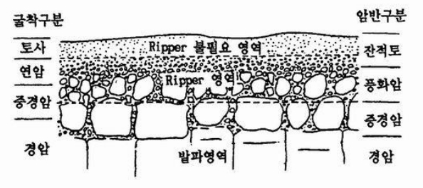 도로시공을 위해 토공작업시 지반을 제거하는 목적으로 사용하는 경우에 통상 사용되는 Excavation 에 해당하는 것으로 한다. 굴착작업의 내용에도 토공(OpenCut), 정지 (Cleaning), 파쇄ㆍ소할(Fragmentation), 적재(Loading)운반 등을 포함하기도한다. 이와 같은 경우의 굴착은 일반적으로 대상암반을 그림(Fig01) 과 같이 암반의 풍화구분상으로 풍화정도에 따라 토층, 풍화암, 연암, 경암으로 구분할 수 있으며 굴착난이도 상으로는 그림(Fig02) 와 같이 토층, 리핑암, 발파암으로 구분할 수 있다.