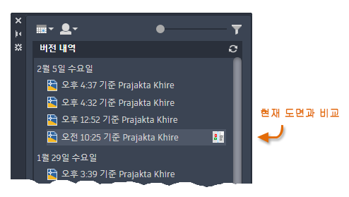 도면 파일을 OneDrive, 드롭박스(Dropbox) 또는 Box 계정에 저장하면 작업할 때 이러한 도면 파일의 추가 버전이 작성되고 버전 내역이 작성됩니다. 이전 버전이 새 도면 사용내역 팔레트에 나열되므로 도면의 현재 버전과 비교할 수 있습니다.