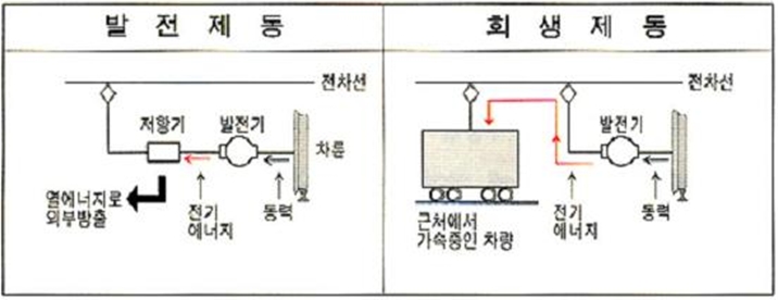 그런데 전기제동에는 제동을 잡을때 발전된 전기를 저항기를 통해 열에너지로 외부로 방출해 버리는 발전제동과 만들어진 전기를 전차선으로 보내 인근에 운행중인 차량에 보내 사용하게 하는 소위 회생제동으로 나눈다. 더운 여름 1호선 전동차를 타고 내릴때 차밑에서 후끈 뜨거운 공기가 올라와 짜증이 나는 것을 경험한 적이 있을텐데 이것이 바로 발전제동시 저항기에서 나온 열 때문이다.