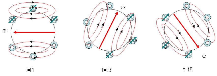 그림과 같은 3상전원의 t=t1 ~ t6 인 순간에 고정자 권선에 흐르는 전류의 방향을 알아 보고 앙페르의 오른손 법칙에 따른 합성 자속의 방향을 알아 보면 다음과 같다.