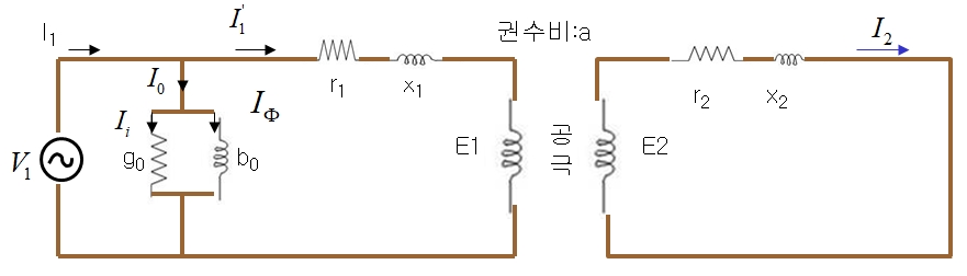 변압기의 등가회로를 기준으로 정지 상태 유도 전동기의 등가회로를 그리면 다음과 같습니다.