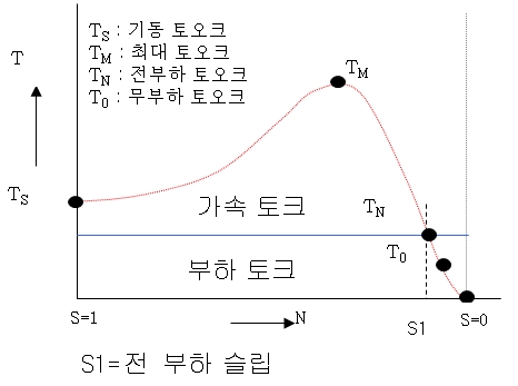 동기속도의 슬립 S=Ns-Ns/Ns=0 : 무부하 운전시 거의 동기속도이며 토크 발생안됨