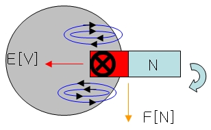 동 원판 중심에 축을 설치하여 중심축을 고정시키고 원판을 돌리면 돌아 가는 상태에서 말굽자석을 주위에 설치하여 시계방향으로 말굽자석을 회전시키면 N극에서 나와 S극으로 들어가는 자속이 원판을 쇄교하는 양이 변화되어 렌쯔의 법칙에 따른 와 전류 가 발생되고 자장내에서 와전류가 원판에 흐르면서 원판에 기전력이 발생된다.