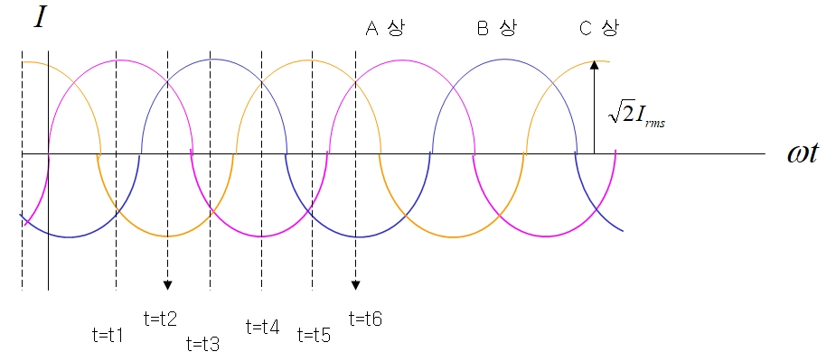 t=t1 인 순간 A상 만 정방향 이고 나머지는 역방향