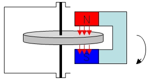 자장 내에서 전류가 흐르므로 플레밍의 왼손 법칙을 적용하면 전자력 F는 시계 방향으로 발생되어 말굽자석과 같은 방향인 시계방향으로 원판은 회전하게 된다 .