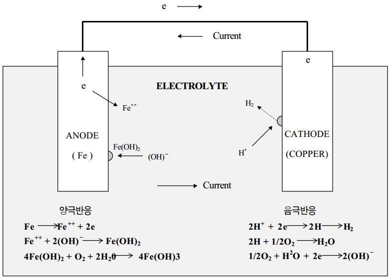 철은 동보다 비금속이어서 철이온은 전해질로 들어가고 철의 전자는 연결부를 통하여 동으로 간다. 철이온은 전해질속에 해리되어 있는 수산이온들과 결합하여 수산화제 1 철이 되고 다시 산소와 결합하여 적갈색의 쇠녹인 수산화제 2 철이 된다. 연결부를 통해 Cathode 로 흘러 들어간 전자는 음극 표면에서 수소이온과 결합하여 수소가 되고 다시 산소와 결합하여 물이 되거나 수소 및 물과 반응하여 수산화 이온을 생성시킨다.