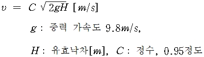 팰톤 수차의 노즐에서 나오는 물의 속도의 개략치를 구하는 식이다.