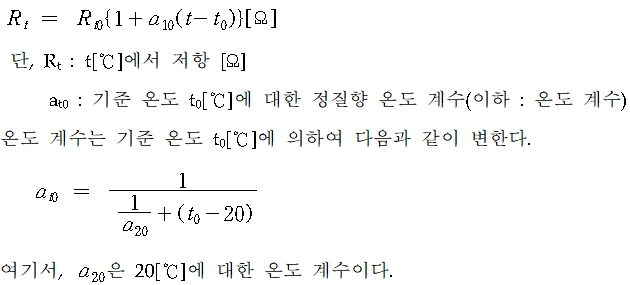 저항은 온도가 상승함에 따라 같이 상승한다. 온도 계수는 도전률에 의하여 변화한다. 동선의 20[℃]에 대한 온도 계수는 퍼센트 도전률을 C라 하면
