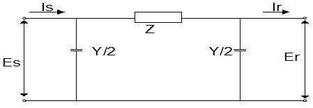 중거리 송전선에서는 선간 용량을 무시할 수 없기 때문에 T형 등가회로에서는 그림과 같이 중앙에 어드미턴스를 놓아 선로임피던스를 두 개로 분리한다. 계산은 복소수를 쓰기 때문에 복잡해지며 또 전류는 선전류이나 전압은 대(對) 중성점의 값이다.