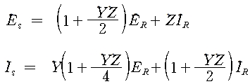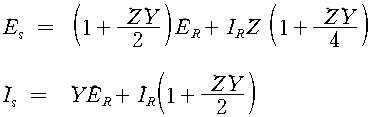 중거리 송전선에서는 선로의 임피던스를 중앙에 모으고 어드미턴스를 2분해서 양단에 놓아 π형으로 한 경우의 송전단 전압의 근사식이다. T형 회로와 마찬가지로 선간 어드미턴스[대(對) 중성선 환산]를 무시할 수 없는 경우에 쓰며 식의 각 요소는 복소수로 나타내어야 한다.