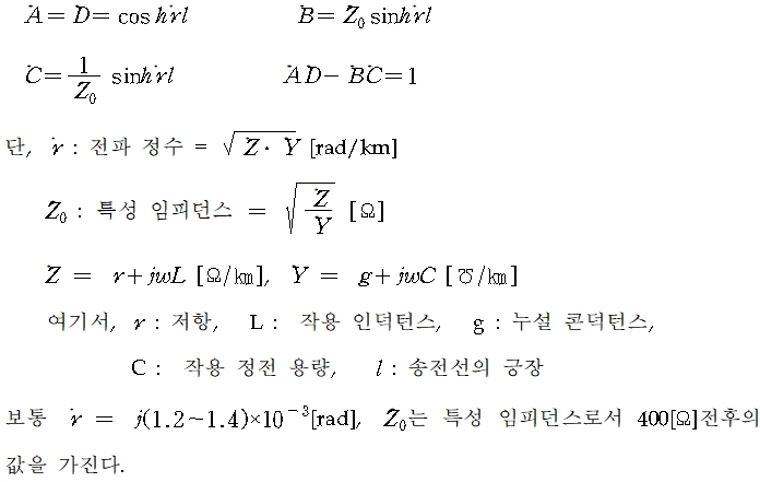장거리 송전선로의 길이의 정의는 명확하지 않으나 보통 300㎞ 이상은 장거리 송전선으로 보아도 된다. Z는 한 가닥의 도선의 단위 길이당 저항과 임피던스로부터 결정하고, Y는 한 가닥의 도선의 대(對)중앙선 용량과 리액턴스로부터 구한다. 전반(전반)정수 γ가 복소수인 경우는 쌍곡선 함수를 전개해서 값을 구한다.