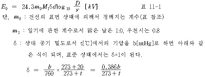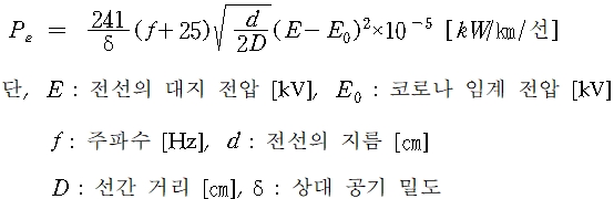 코로나가 발생하면 전력 손실이 따른다. 코로나 손실에 관한 Peek의 실험식은 다음과 같다.