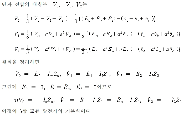 3상 교류발전기에 임의의 불평형 전류가 흐를 경우 그 단자전압과 전류와의 관계를 구한다. 3상 교류발전기의 각상의 유기전압은 3상대칭이므로 무부하시 그 단자전압은 3상평형 상태에 있게된다. 그러나 이 발전기에 불평형 부하를 걸면 불평형 전류에 의한 전기자 권선의 전압강하 때문에 그 단자전압은 비대칭으로 된다.