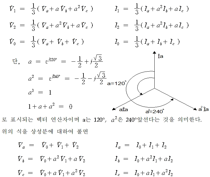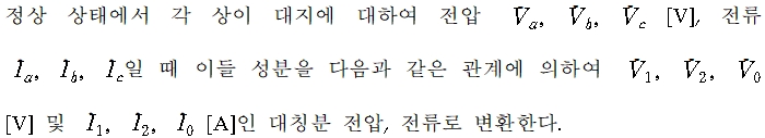 고장시에는 일반적으로 3상회로는 비대칭으로 되어 계산이 곤란하게 되므로, 이를 영상․역상․정상의 3개 대칭 회로로 분해하여 계산한 다음 그 결과를 합하여 해를 구하는 방법을 대칭 좌표법이라 한다.
