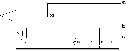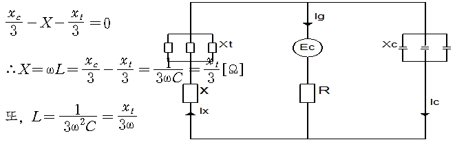 그림에서 소호 리액터의 인덕턴스를 L, 각 상 대지 정전 용량을 C라고 하면, 소호 리액턴스 X와 대지 정전 용량의 리액턴스 Xc는