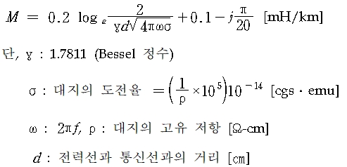 통신선과 각상의 상호 인덕턴스 M[H/㎞] 값은, 전류의 귀로인 대지의 도전률이 균일한 경우에는 카슨-폴라체크(Carson Pollaczek)의 식으로 계산한다.