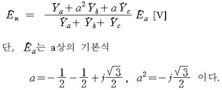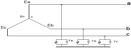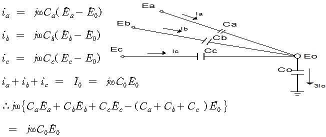 그림에서와 같이, 각 상 대지 어드미턴스를 Ya, Yb, Yc 라 하고 a상의 기전력을 기준 벡터로 하면, 잔류 전압 En은 다음과 같다.