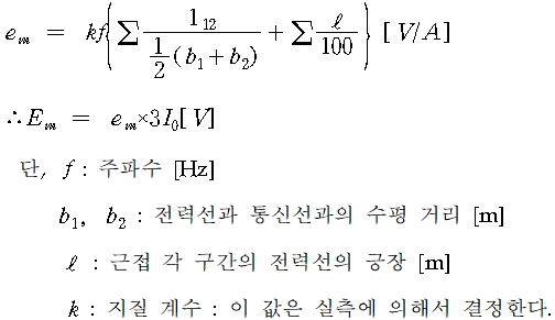 윗 식에서의 괄호 내 계산은 5만분의 1지도상에 전력선과 통신선을 그리고, 전력선을 기준으로 해서 제 1항은 100~5,000[m]의 근접 부분에 대해, 제 2항은 100[m]이내의 근접 부분에 대해서 계산하며, 5,000[m] 이상은 생략한다.