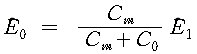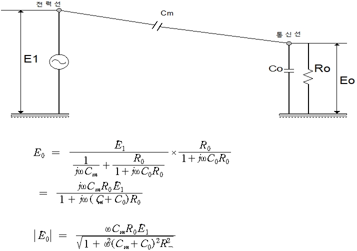 단선식 전력선과 단선식 통신선이 근접하고 있는 경우에 양선간의 정전 용량을 Cm, 통신선의 대지 정전 용량을 Co라 하면, 전선의 전위가 E1일 때 통신선의 정전 유도 전압 E0는 다음과 같다.