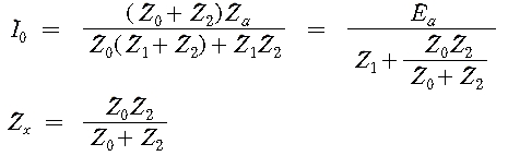 즉, 1선 접지시의 정상 회로의 임피던스는 Z0+Z2를 Z1과 직렬로 한 것의 등가이다. 또, Z0, Z1, Z2는 각각 고장점에서 본 송․수전 양단의 임피던스를 병렬로 한 것이므로, 정상 회로에 대하여 생각하면 Zx=Z0+Z2인 임피던스가 고장점과 가상 중성선간에 삽입된 회로와 등가이다.