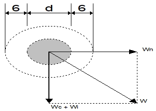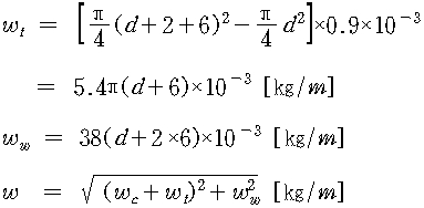 이도 계산에서는 전선의 무게 Wc[㎞/m]만을 생각하였으나, 풍압 Ww과 빙설 Wt도 각각 고려되어야 한다. 풍압에는 갑, 을 및 병종의 3종류가 있고, 갑이 76[㎏/㎡], 병이 그 1/2, 을은 전선 주위의 두께 6[㎜], 비중 0.9인 빙설이 부착한 상태에서 38[㎏/㎡]로 본다(전기 설비 기술 기준령 제64조 참조). 따라서 을종인 경우의 합성 하중은 다음과 같다.