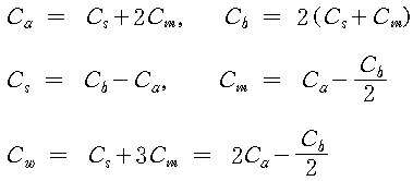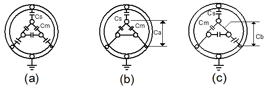 3심 케이블의 각 정전 용량의 관계는 그림에 나타낸 것과 같으며, 여기서 Cs는 대지 정전 용량, Cm은 상호 정전 용량을 표시한다. 그림 (b)처럼 1심과 다른 2심 연파와의 사이의 정전 용량을 Ca라 하고, 그림 (c)처럼 2심을 일괄한 것과 다른 1심 연파와의 사이의 정전 용량을 Cb라 하면, Ca, Cb의 축정치에서 Cs, Cm 및 작용 정전 용량 Cw는 다음과 같이 구해진다.