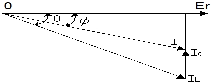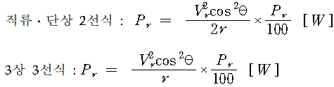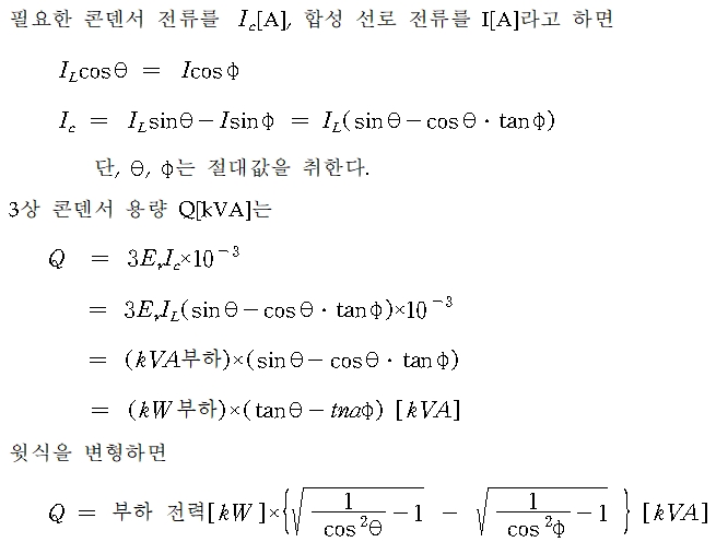 Er를 부하의 선형 전압[V], IL을 부하 전류[A], cosθ를 부하 역률이라 하고, 콘덴서를 설치해서 역률을 cosθ로부터 cosφ로 개선하는 데에 요하는 무효전력을 구하는 식이다.