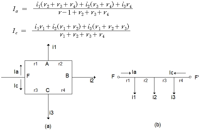 그림(a)와 같은 1점 급전의 환상식 배전선은 급전점 F에서 회로를 개방한 그림(b)와 같은 양단 급전의 회로가 되므로, F에 의해 A 및 C에 흐르는 전류 Ia및 Ic를 구할 수 있다.