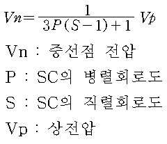 예) 6.6KV, 3000KVAR Bank를 단기 3.8KV, 200KVA로 구성, Y결선 하였을 때 소자1개 파괴시 검출전압을 구하라.(S.R 무시한 경우) 3.8KV, 200KVA(단기 내부 직렬 회로수 2), 각상에 5대 병렬 설치하면 S: 2, P:5, Vc:70(V)로 하면