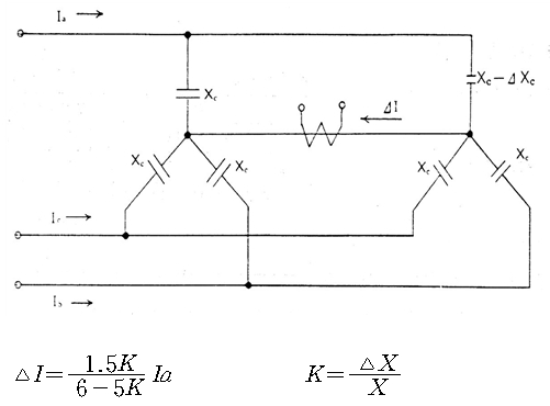 콘덴서의 정상 운전시에는 중선점간의 전류가 흐르지 않고 내부고장 발생하였을 경우 두 중성점간에 불평형 전류가 흐르게 된다. 한쪽 콘덴서 소자가 완전 단락되면 고장상의 전류는 정격전류의 3배가 되고 정상상에는 루트3배의 전압이 가해진다.