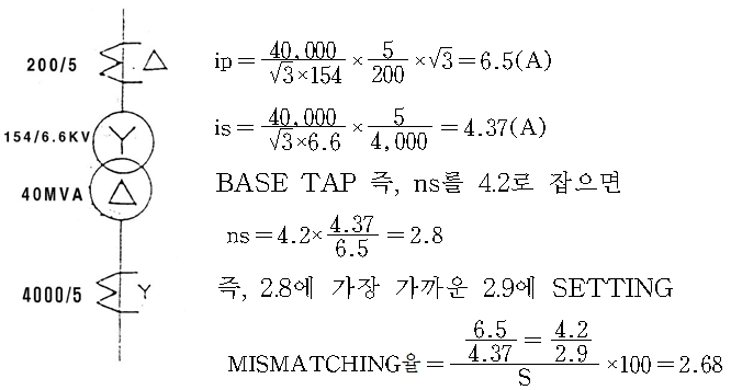 비율 탭치는 아래식에서 구한 총 오차 전류의 최고치보다 크도록 정정한다.
