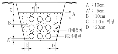 · 관로 부분 되메우기시 관로 상단 10cm 까지는 되메움재로 모래, 양질의 토사 또는 석분을 사용하고 기계 또는 인력으로 다지기를 시행한다.