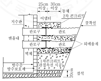 · 구조물(맨홀, 핸드홀, 전력구 등)과 관로와의 연결은 통합형 합성수지 관로구 또는 나선형·원형 파형관용 관로구를 사용하며 아래의 그림과 같이 시공한다.