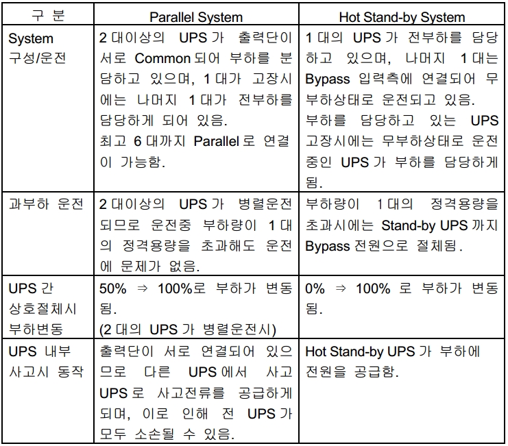 UPS 는 System 구성방법에 따라 1 대의 UPS 만으로 이루어져 운전되는 Single System 과 2 대이상의 UPS 로 이루어진 Dual System 으로 분류할수 있다. (그림<Fig01~03> 참조) Dual System 은 다시 Static Switch 구성방법에 따라 Parallel System, Hot Stand-by System 으로 분류되며 , 각각에 대해 특성을 비교해 보면 <표01> 과 같다.