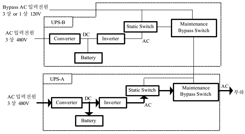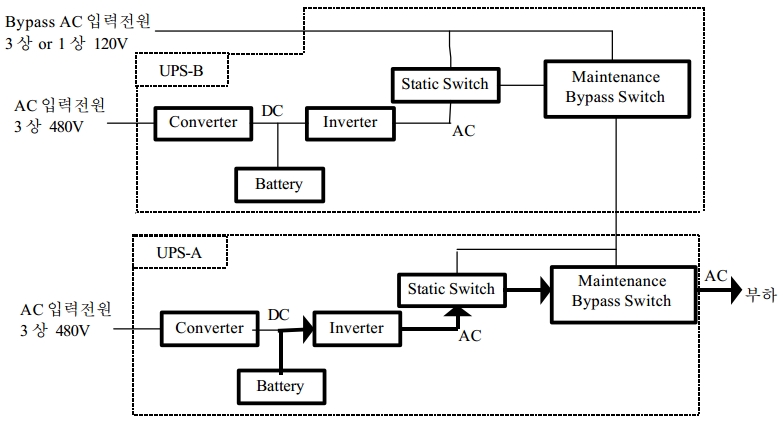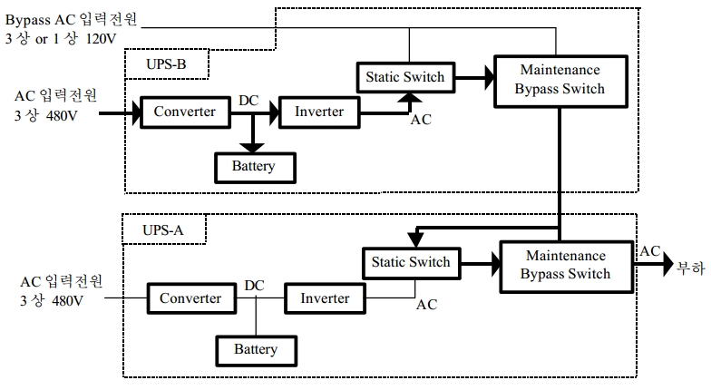 UPS-A 와 UPS-B 는 상기 그림과 같이 Maintenance Bypass Switch 를 통해 서로 연결되어 있으며 , 정상운전시에는 UPS-A 를 통해 부하에 전원이 공급되며 , UPS-B 는 무부하상태로 운전된다.