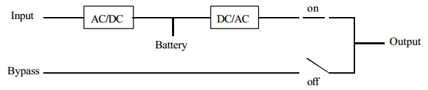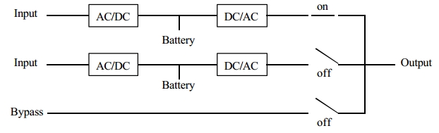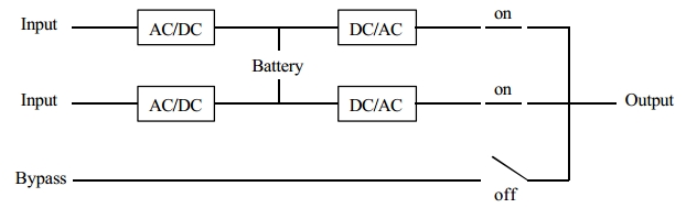 Converter 또는 Inverter 에 고장이 발생하거나 AC 입력전원 정전후 Battery 방전이 끝나면 Static Switch 에 무순단으로 Bypass AC 입력전원으로 자동절체되며 , Inverter ↔ Bypass 간에는 수동으로 무순단 절체가 가능하다. 다음 그림과 같이 Hot Stand-by System 의 경우에는 UPS-A 가 고장시 UPS-B 로 무순단 절체가 이루어지며 , UPS-B 가 고장시에는 UPS-B 만 Bypass 전원으로 절체되고 UPS-A 는 부하에 전원을 계속 공급할 수 있다.