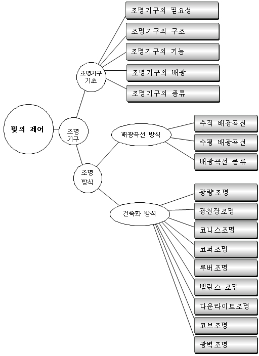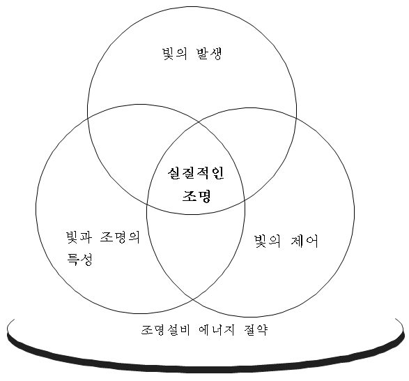 조명은 자연광이 주체가 된 주광조명과 인공광원이 주체가 된 인공조명으로 크게 불리할 수 있으며 그 조명의 실체는 조명설비의 에너지절약 바탕 위에 빛의 발생, 빛의 제어, 빛과 조명의 특성이 조화롭게 구성되어 있다고 하여야 하겠다.